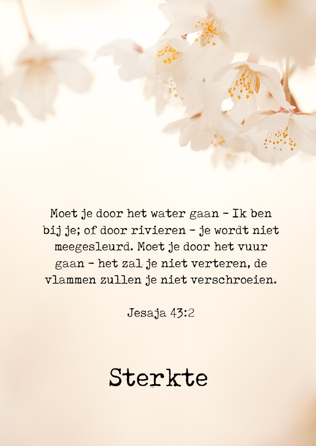 Leuke voordeelkaart met de tekst ‘Moet je door het water gaan – Ik ben bij je; of door rivieren – je wordt niet meegesleurd. Moet je door het vuur gaan – het zal je niet verteren, de vlammen zullen je niet verschroeien. Jesaja 43:2’