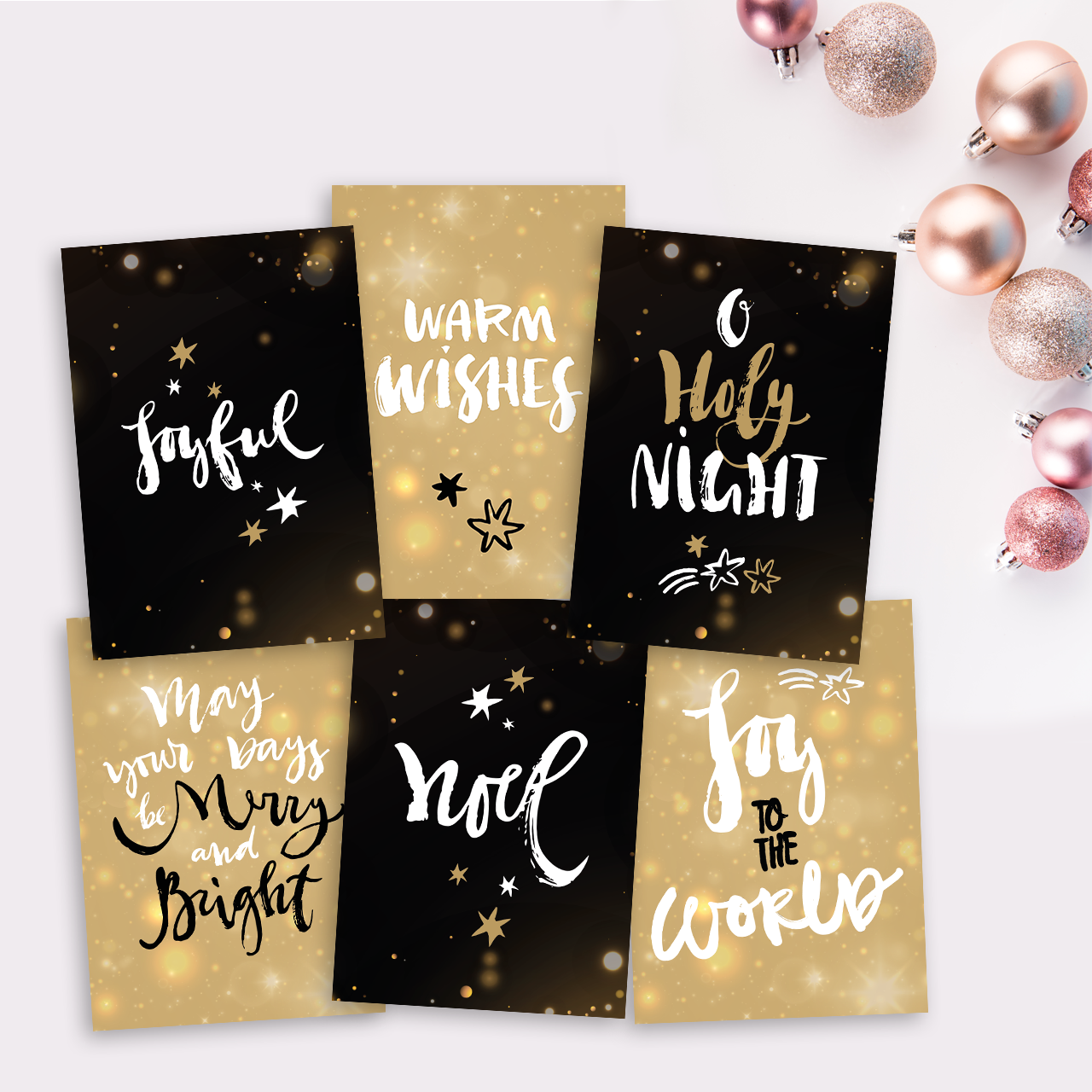 Set van zes enkele kerstkaarten in een stijlvolle uitvoering met goud en zwart. Perfect om jouw kerstwensen met elegantie en warmte te delen. Deze luxe kaarten zijn ideaal om te versturen en voor slechts €4,99 heb je een prachtig voordeelpakje in handen.