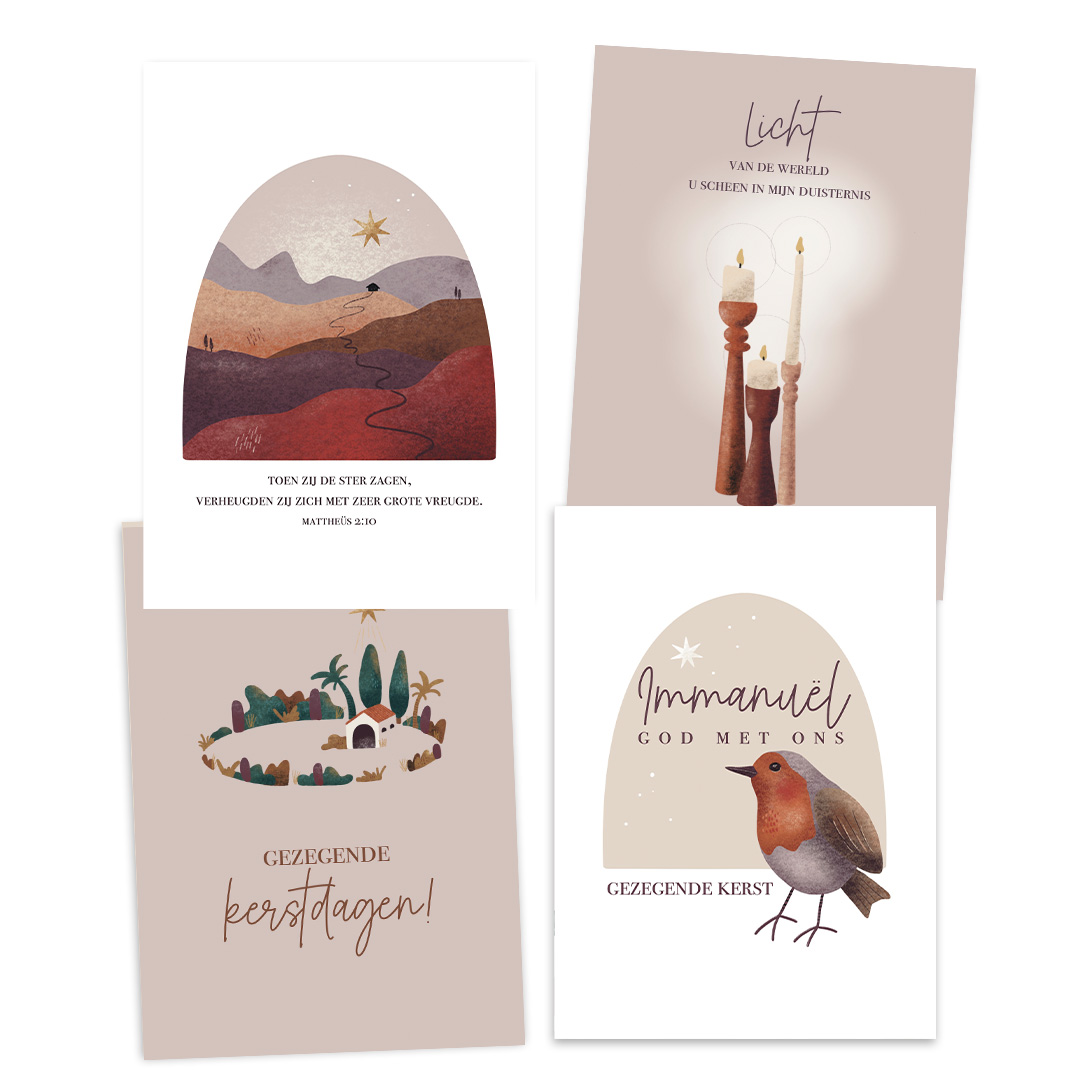 Voordeelpakje met 12 kerstkaarten, bestaande uit 4 verschillende ontwerpen.