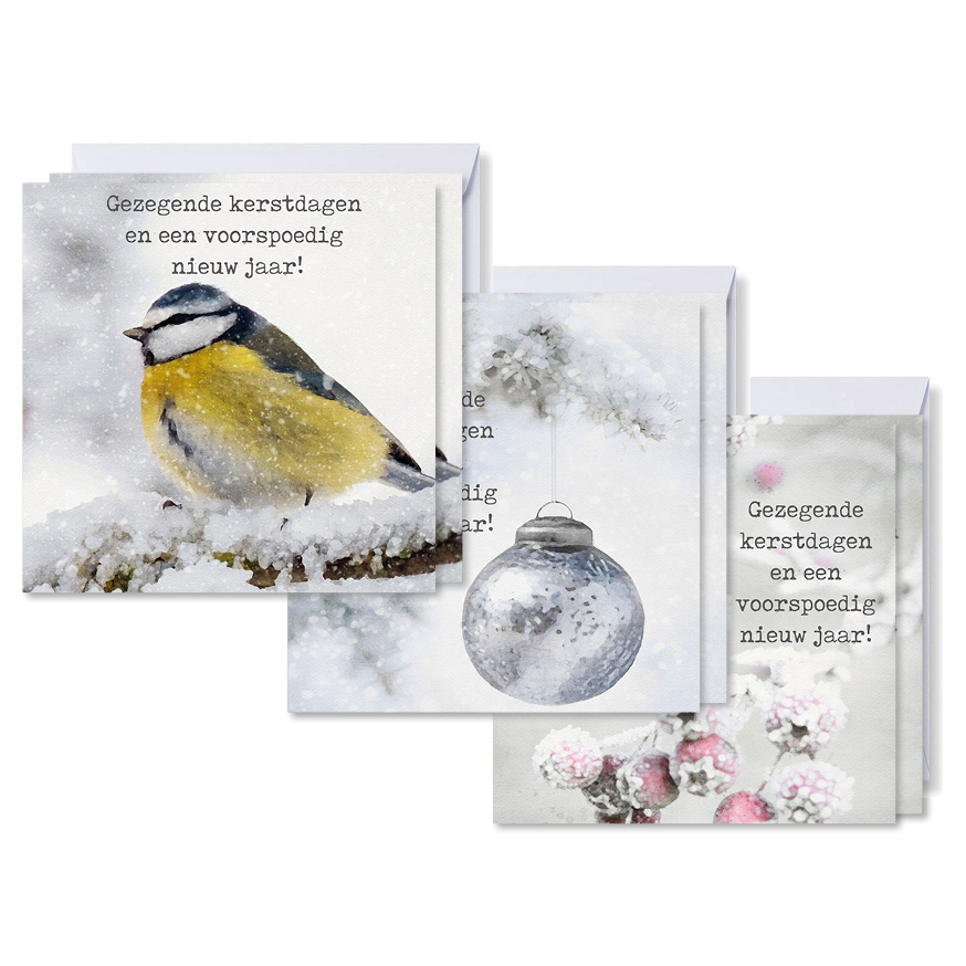 Breng nostalgie in je kerstgroeten met deze sfeervolle retro kerstkaarten. Het voordeelpak bevat 6 enkelzijdige kaarten met envelop, in 3 prachtige designs: pimpelmees, rode besjes en een klassieke kerstbal. Elke kaart heeft een blanco achterzijde voor jouw persoonlijke boodschap. Perfect voor een warme kerstgroet!