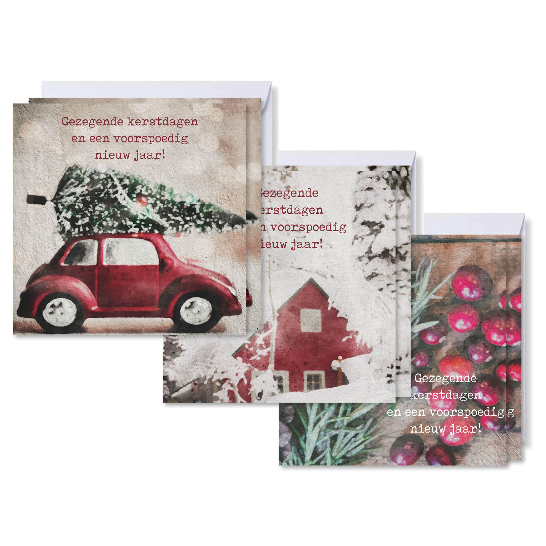 Stijlvolle retro kerstkaarten met charmante rode accenten, zoals een auto met kerstboom, een besneeuwd huisje en rode besjes. Deze set bevat 6 enkelzijdige kaarten (2 van elk design) inclusief enveloppen. De blanco achterzijde biedt volop ruimte voor jouw persoonlijke boodschap. Perfect om deze kerst extra bijzonder te maken!