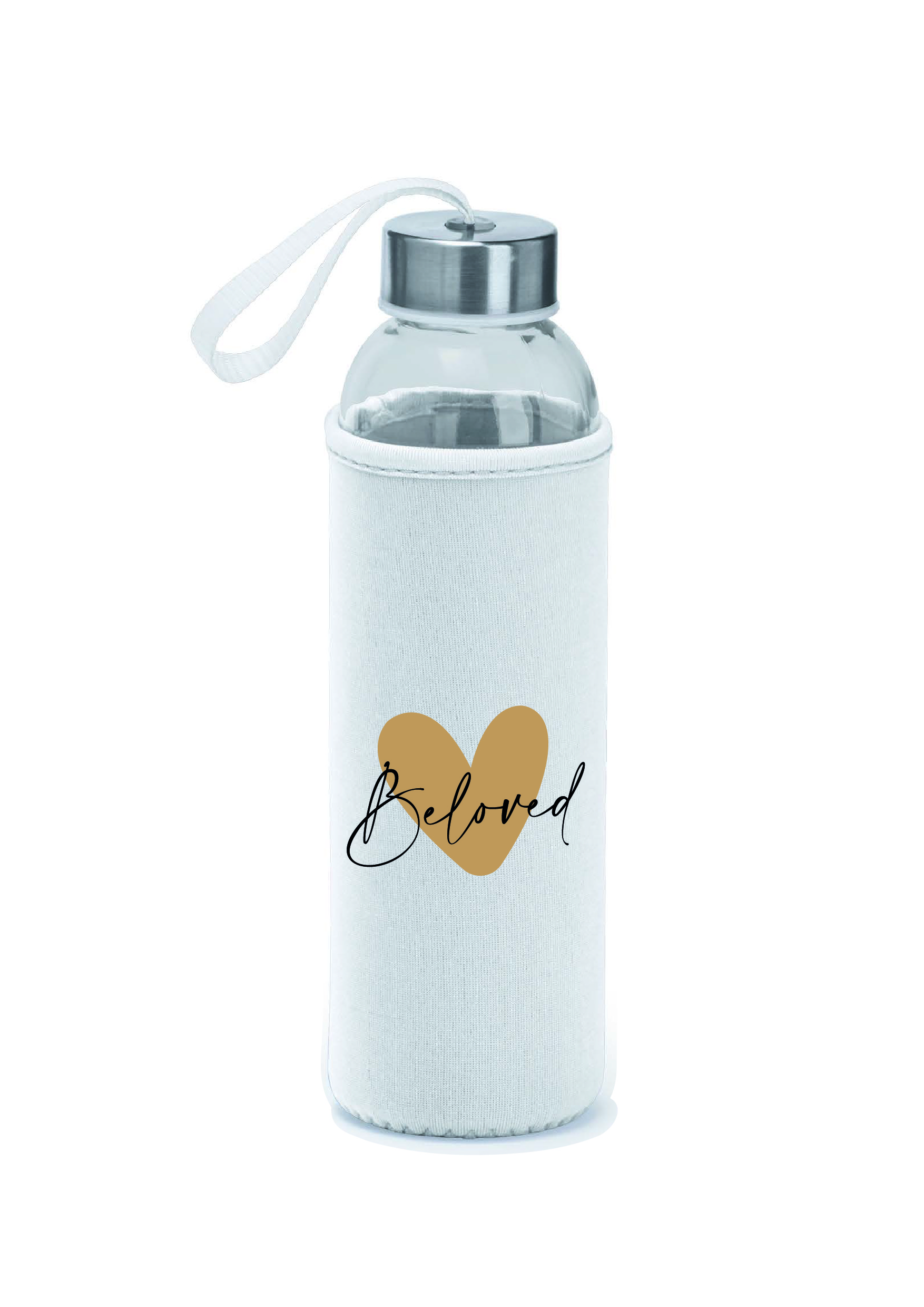 Prachtige glazen waterfles met bedrukte hoes ‘Beloved’.