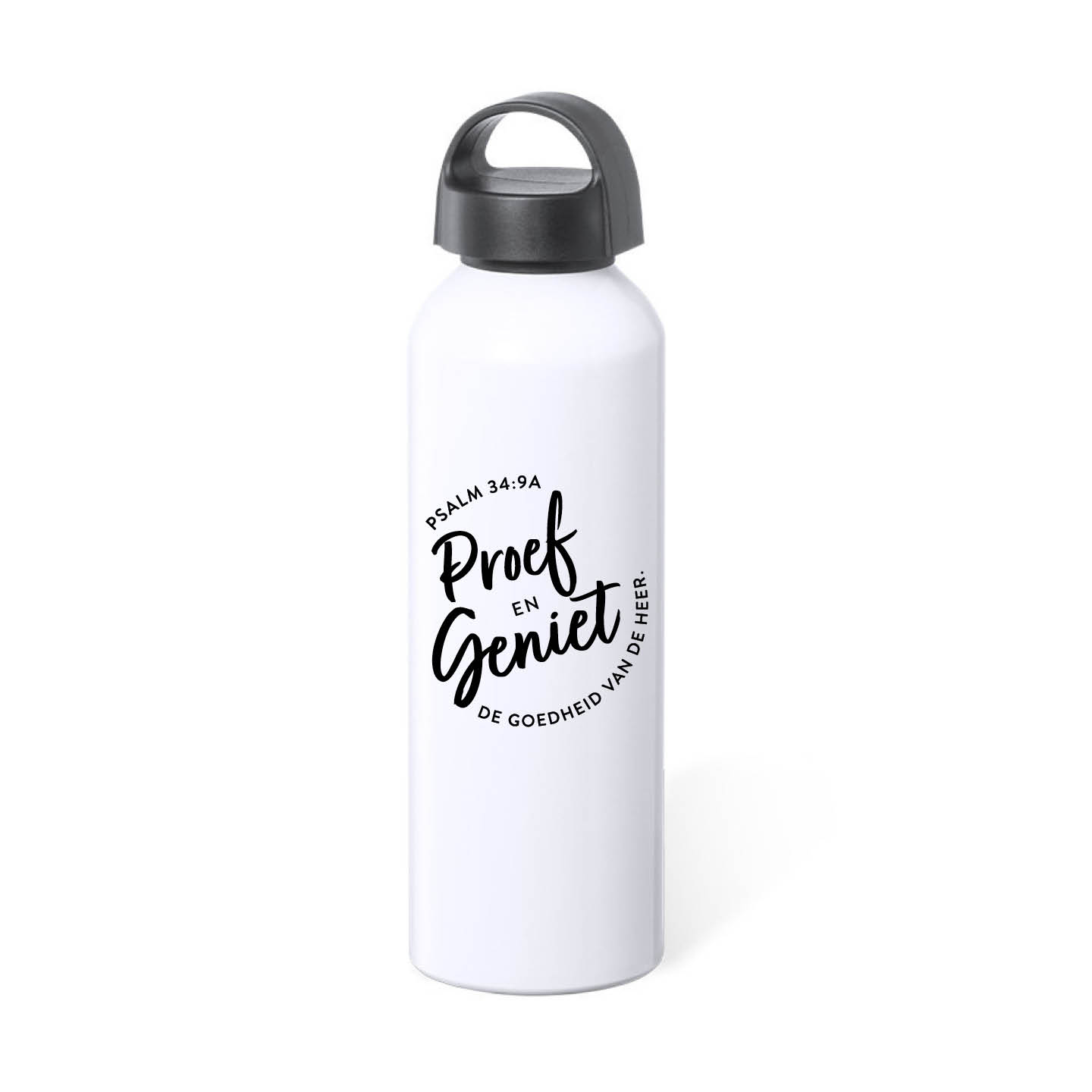 Op zoek naar een stijlvolle en inspirerende drinkfles? Deze witte fles van 800 ml met de bemoedigende tekst ‘Proef en geniet (Psalm 34:9a)’ herinnert je eraan elke dag te genieten van Gods goedheid.