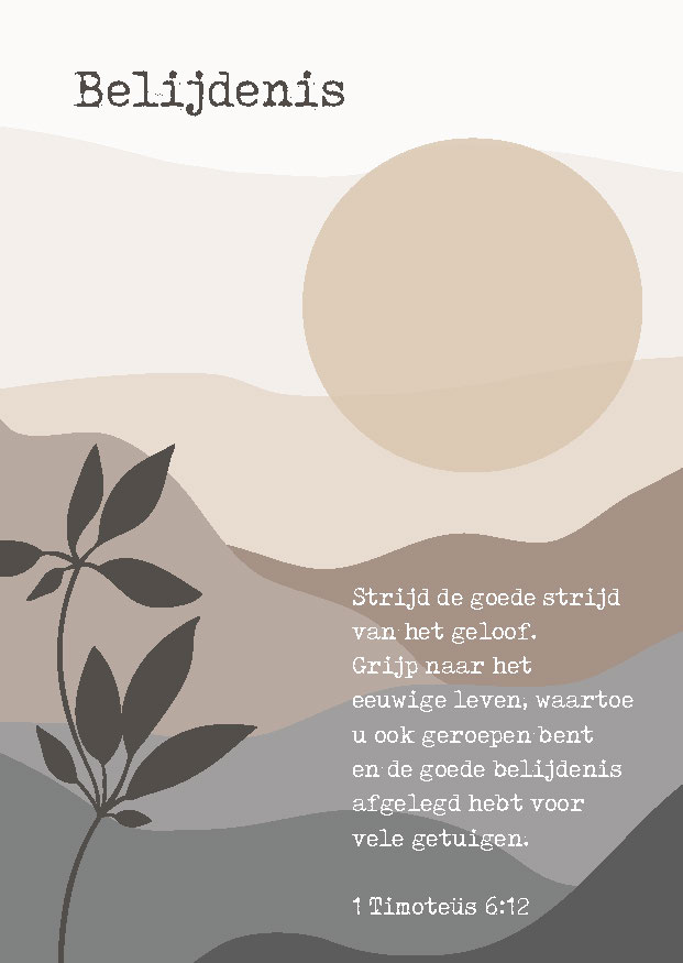 Tekst: “Strijd de goede strijd van het geloof. Grijp naar het eeuwige leven, waartoe u ook geroepen bent en de goede belijdenis afgelegd hebt voor vele getuigen. 1 Timoteüs 6:12” (HSV)
