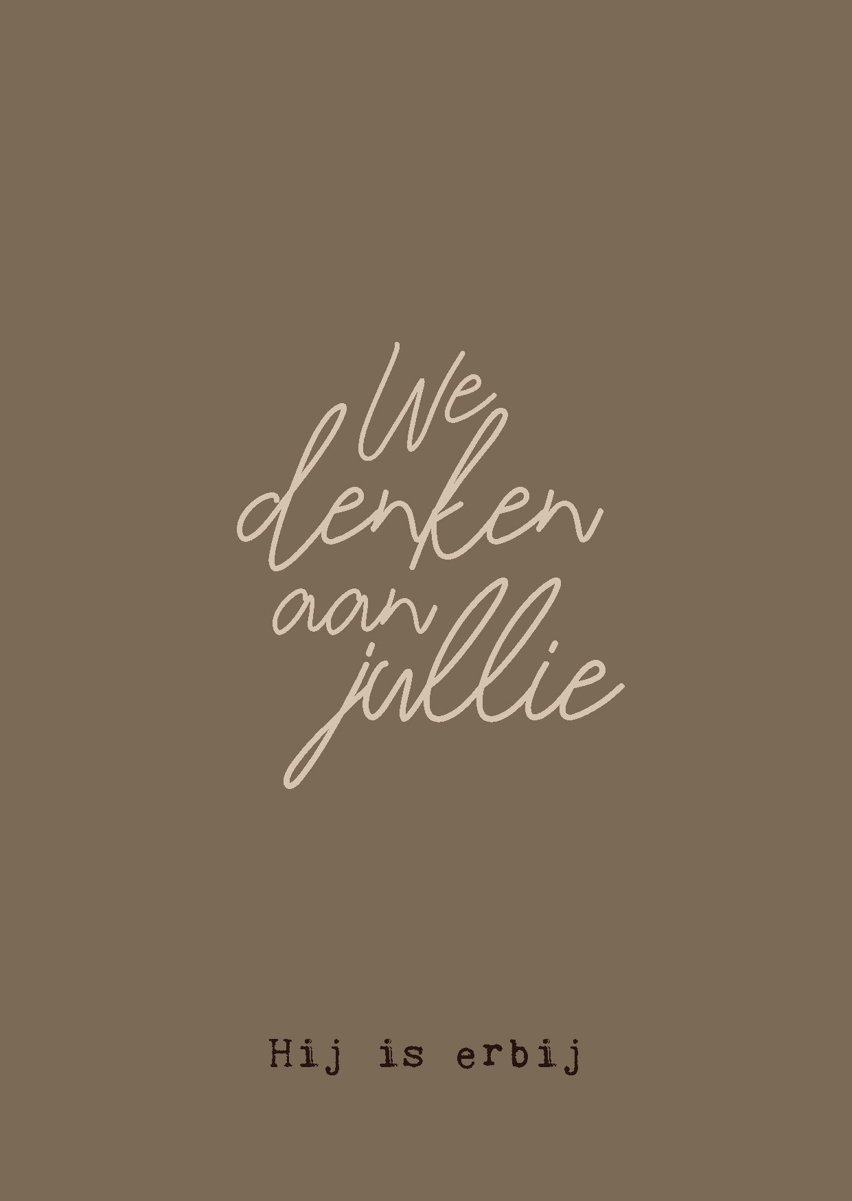 Christelijke dubbele kaart van ca 11×16 cm met de tekst: ‘We denken aan jullie, Hij is erbij’
